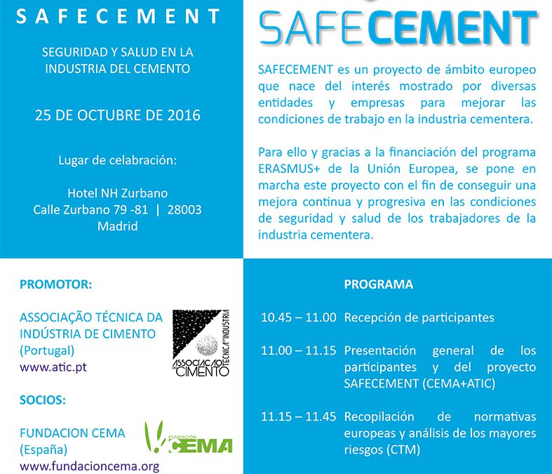 El próximo 25 de octubre de 2016 tendrá lugar en el hotel Nh Zurbano de Madrid, el Seminario Internacional de la presentación del proyecto “Safecement” (Cofinanciado por la Unión Europea, dentro de la iniciativa del año 2014, acción clave KA2, Asociaciones estratégicas en el campo de la Formación Profesional), organizado por la Fundación Laboral del Cemento y el Medio Ambiente (Fundación CEMA).