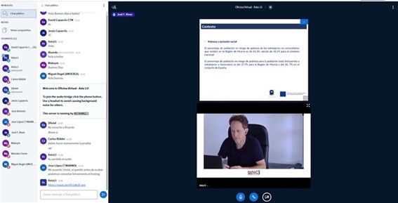 Se celebran encuentros online de manera semanal a los que asisten los participantes del proyecto para abordar estrategias y definir las tareas necesarias para lograr los objetivos marcados. Actualmente, los socios del proyecto están desarrollando las salas virtuales de la feria virtual eMurcia.