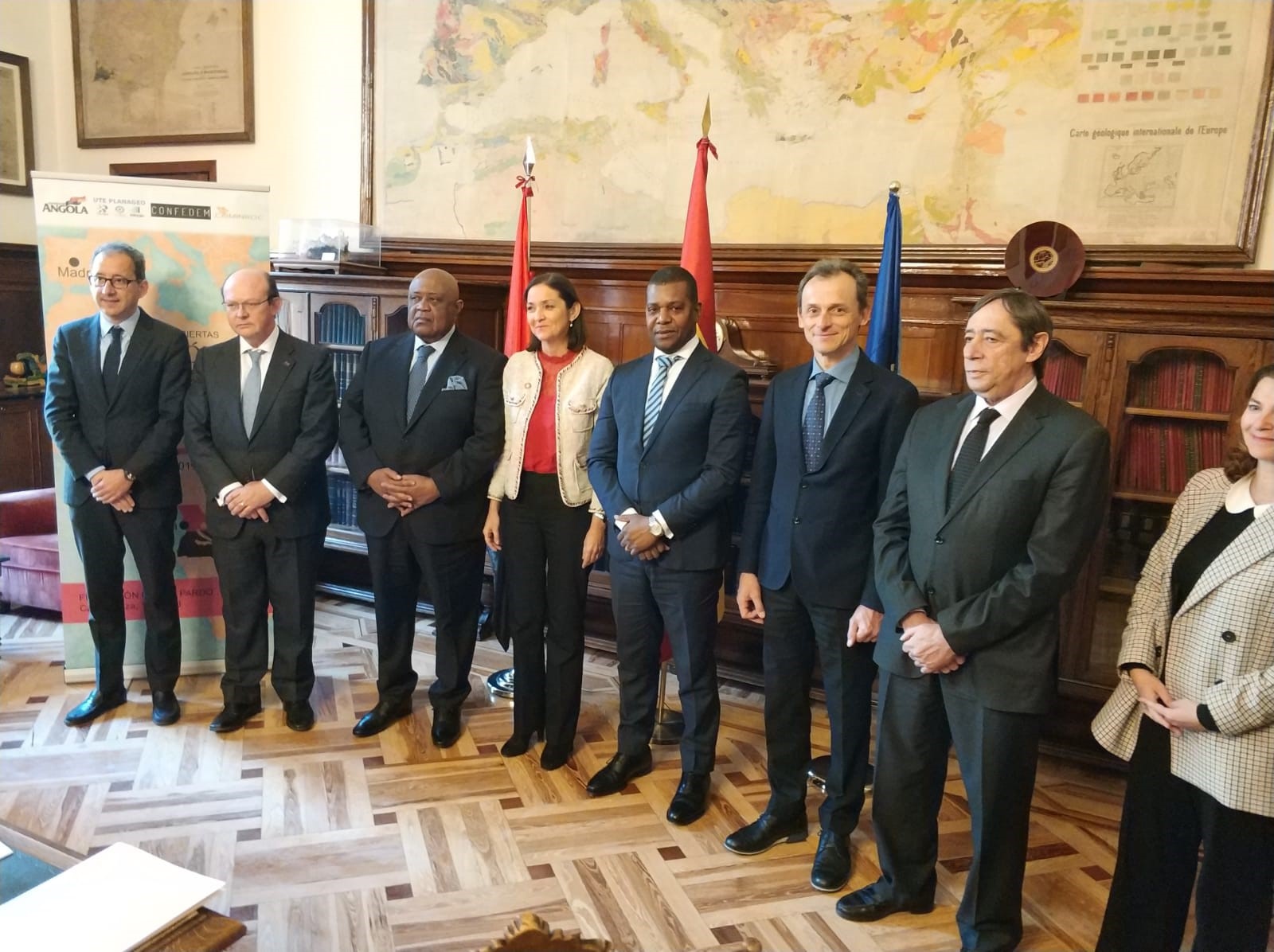Con motivo de las jornadas, la Ministra de Industria, Comercio y Turismo, Reyes Maroto y el Ministro de Ciencia, Innovación y Universidades, Pedro Duque y el Secretario General de Coordinación de Política Científica-MICIU, Rafael Rodrigo, han celebrado un encuentro informal con la delegación angoleña del Ministerio de Recursos Mineros y Petróleos. Ambos ministros han mostrado el respaldo del Gobierno de España al proyecto PLANAGEO, concebido como el mayor programa de producción de información geológica y minera del país africano que está permitiendo una mejor gestión y explotación de los recursos minerales, además de un mayor conocimiento de la geología angoleña y sus posibles aplicaciones industriales.