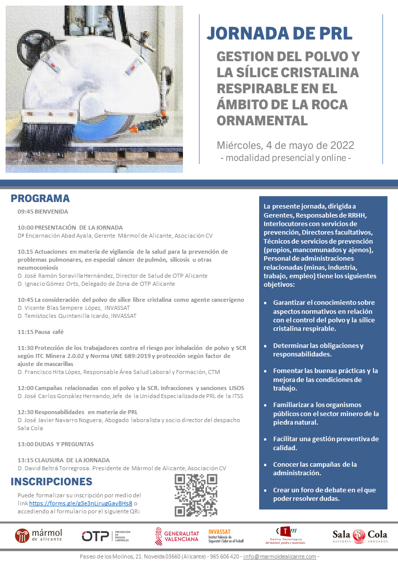 Dada la relevancia de la materia, el próximo miércoles 4 de mayo, se celebra la jornada ‘Gestión del Polvo y la Sílice Cristalina Respirable en el Ámbito de la Roca Ornamental’, en la que se tratarán asuntos tan interesantes como las actuaciones en materia de vigilancia de la salud para prevención de problemas pulmonares; o la consideración del polvo de sílice cristalina como agente cancerígeno.