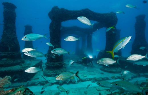 Ejemplo de arrecife artificial en Florida. El Neptune Memorial Reef, un santuario submarino único que combina la preservación marina con un homenaje eterno, inspirado en la mítica ciudad de Atlantis