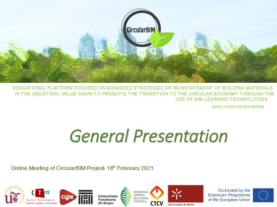 La Asociación Empresarial de Investigación Centro Tecnológico del Mármol, Piedra y Materiales asistió el pasado 18 de febrero a una reunión online del proyecto CircularBIM bajo el título “Plataforma educativa centrada en estrategias avanzadas de reinstalación de materiales de construcción en la cadena de valor industrial para promover la transición a la economía circular mediante el uso de tecnologías de aprendizaje BIM”.